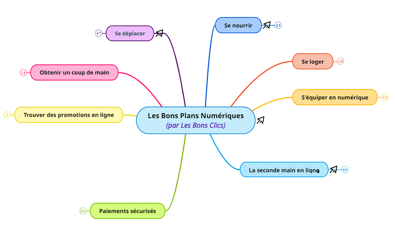 La carte interactive des bons plans numériques a été réalisée avec le soutien de la Fondation Cetelem. C’est un hub de contenu hébergé sur Les Bons Clics qui relaie chaque mois des bons plans dans 8 domaines différents pour consommer moins cher et de manière plus responsable grâce au numérique :